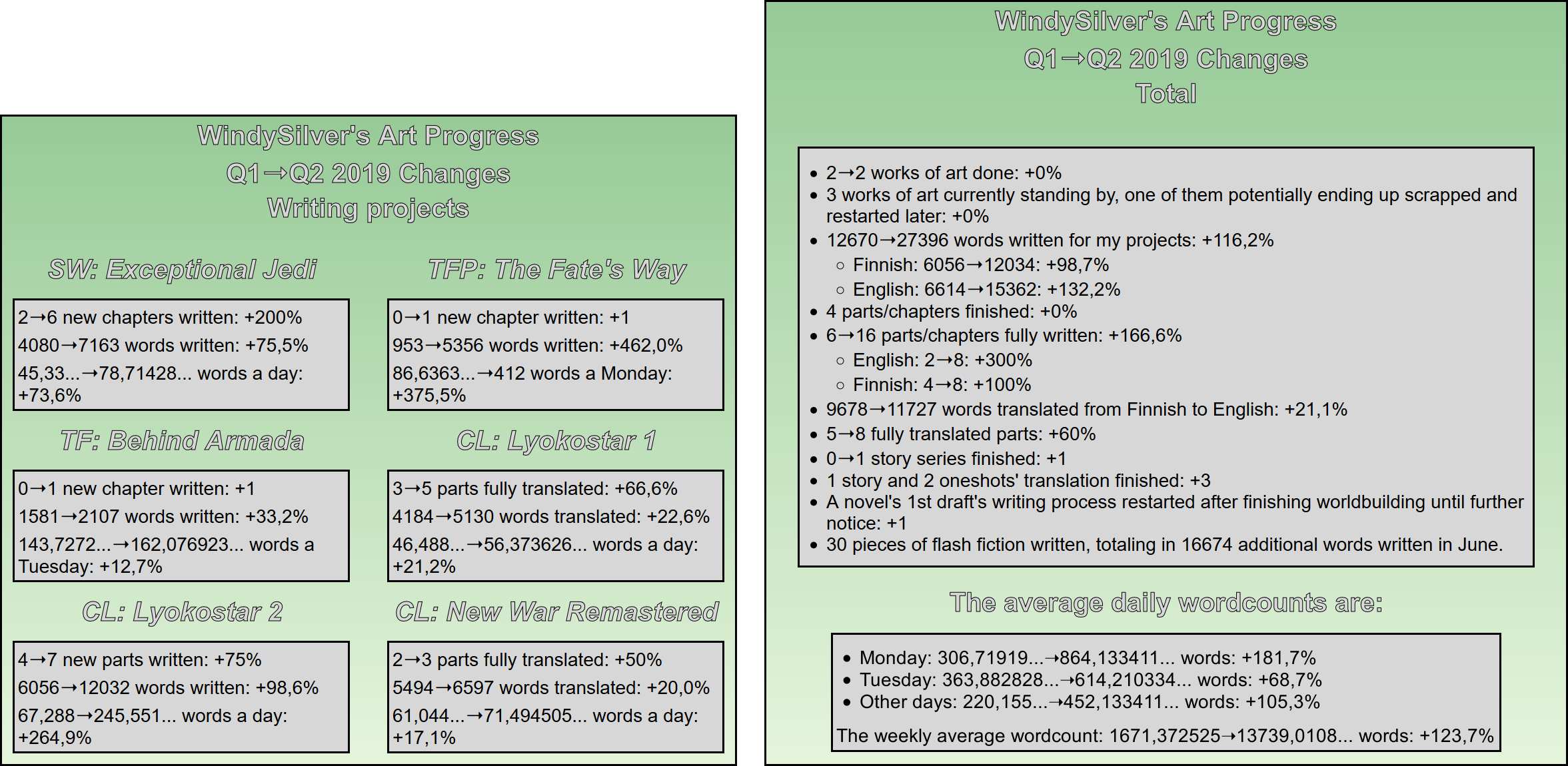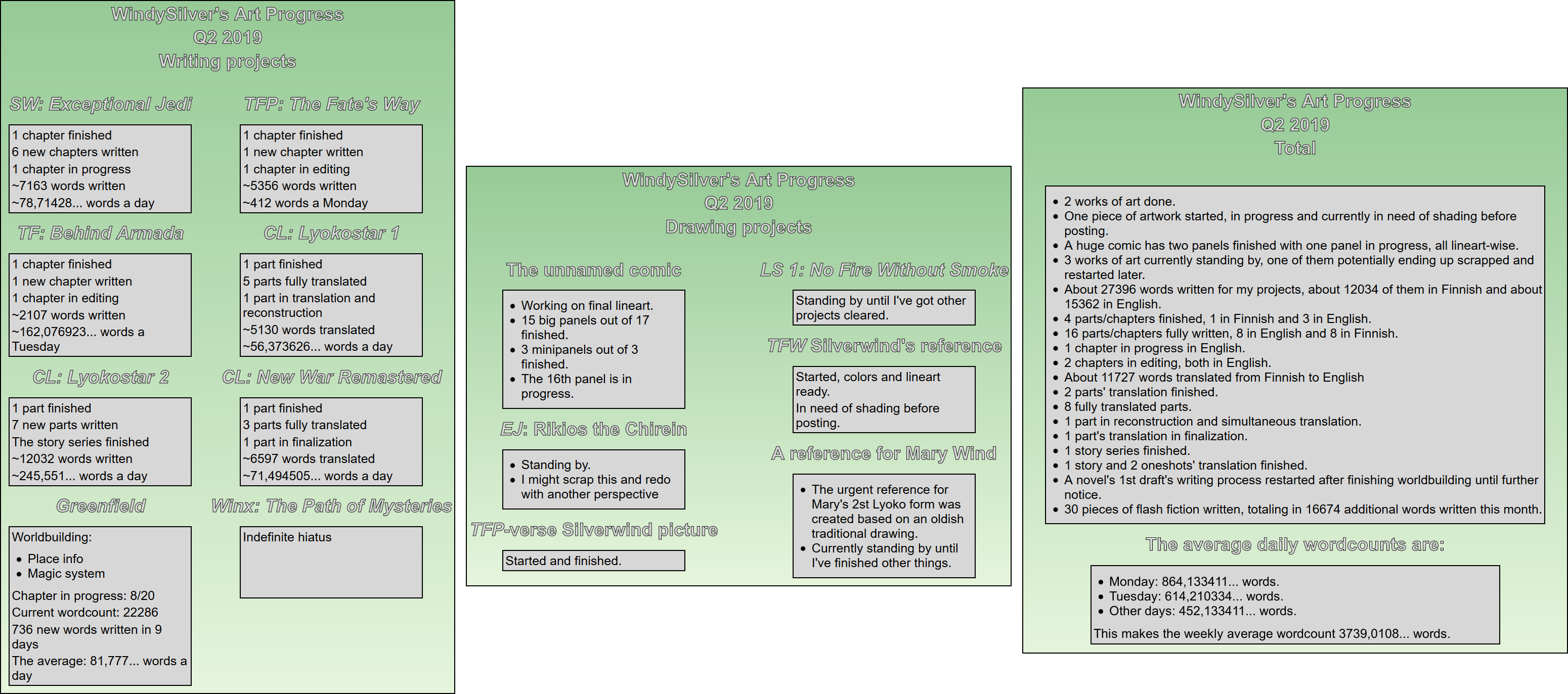 What will happen in Q3? Only FFM 2019 statistics I can say for sure. Will I see a decrease in productivity once the studying year begins? Probably not, as the actual work will cover only about a third of the quarter. In addition to that, I’ve now committed myself to work more on my stories: firstly, to write at least 100 words to Greenfield every day in order to get a decent pace of progress I can keep up (meaning I should reach a chapter’s target wordcount in 40 days at most if there is no usable material already written). Secondly, to work more in a day during editing or finalization so that the phases when I don’t write basically anything on the projects in question will be shorter, which then gives me more days in a quarter to write. Naturally, as Lyokostar 2 is finished in Finnish, it will be dropped out of the statistics until its turn to be translated to English comes up, which will definitely be a long time away; I suspect that it could be in 2021 at the earliest, depending on how much work the three quarters of Lyokostar 1 I have left give me; I have needed to completely rewrite three parts of story 4 and there is a lot of reworking to be done with the rest of the parts, so it definitely isn’t looking promising.