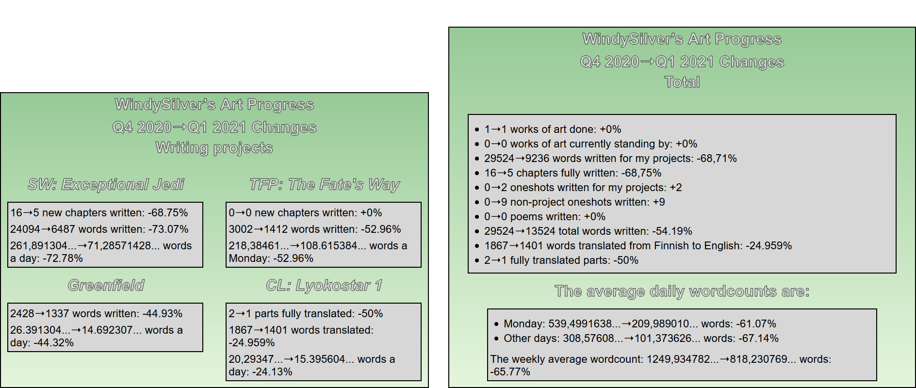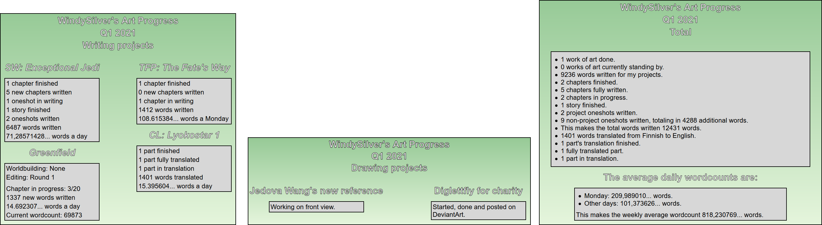 Anyway, I think I’ve written enough about The Gauntlet and the saddening state of the platform that’s made me the artist I am today. It’s time to move on to Q1 2021 stats! Not that they’re anything as exciting as The Gauntlet’s results; it’s mostly a decline in numbers as I have been far too busy with coursework to do much art-wise (especially Greenfield and drawing projects have suffered). Between the game project course, working on my bachelor’s thesis and trying to churn out the rest of the courses I need done in order to get my bachelor’s degree next fall at the latest, I haven’t had much time and energy for art. The trend will most likely be the same during this quarter as well since I’m doing crunches to get my thesis done, and then I’ll have to spend the rest of the spring and summer getting those courses finished.