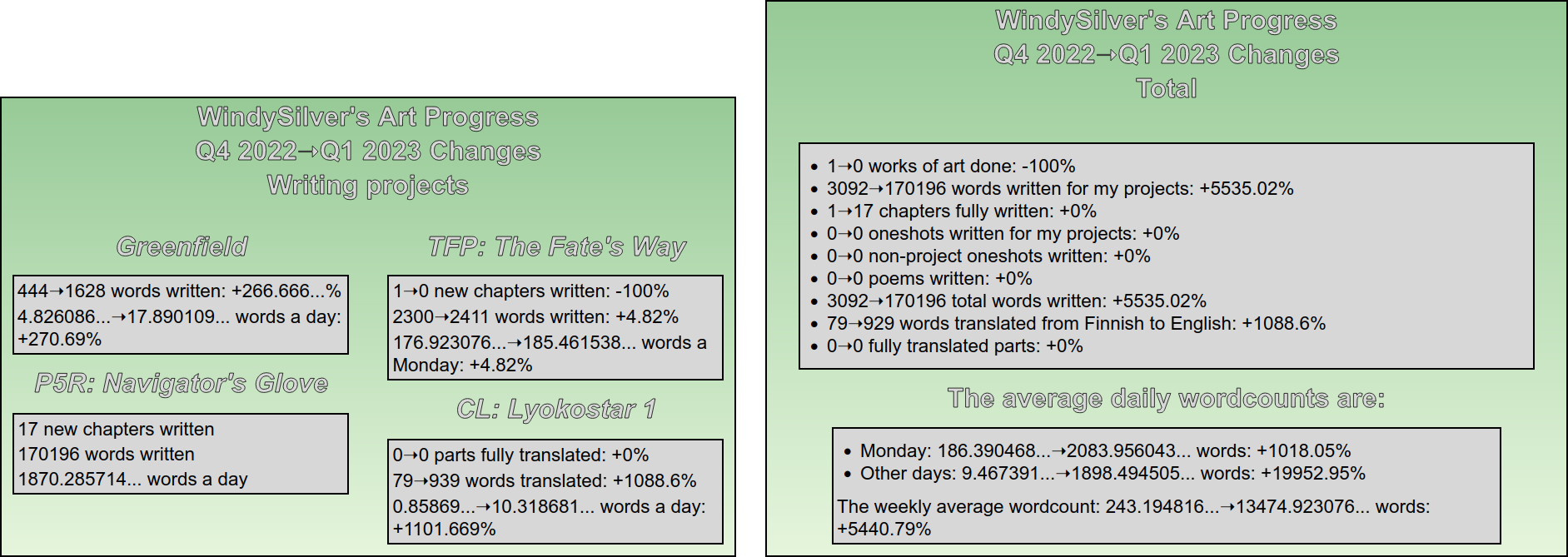 So yeah, a lot has happened in the last few weeks, although my other projects have seen little progress. My creative juice for them seems to still be running low, which are clearly visible in the Q1 2023 stats, where adding Navigator’s Glove caused the levels of increases I ended up doubting my math and checking my last year’s statistics to check that I’m reading the numbers correctly.