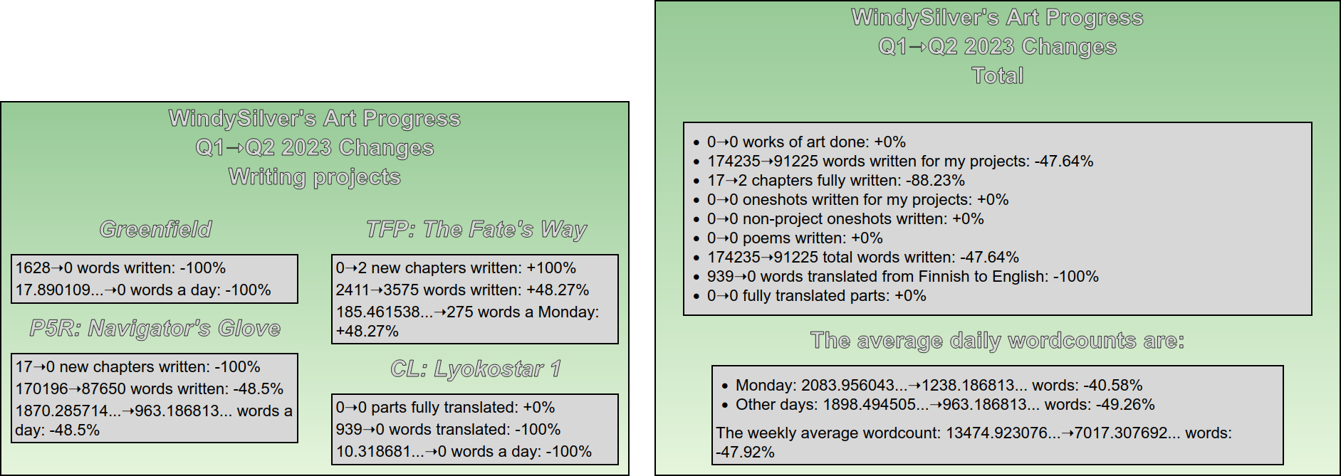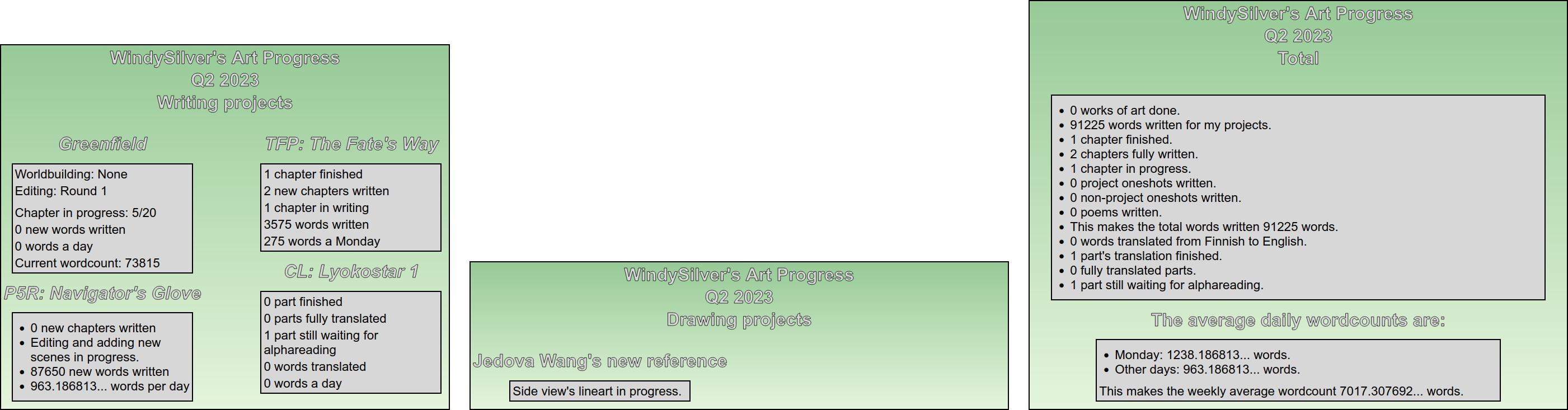 Before the statistics, though, I must say that there’s not much to be said about the later half of the quarter. I’ve been just working and writing for the most part. I never found the time to consider what I want to do with Greenfield, unfortunately. I hope I’ll be able to do that by the end of Q3, but no promises on that. As for Lyokostar 1, I am planning on tackling the alphareading of the part that’s been on a standstill for months sometime soon. For now, though, I’m planning on prioritizing FFM, which kicked off today on WordPress, and revising TFW chapters that have been sitting waiting for ages.