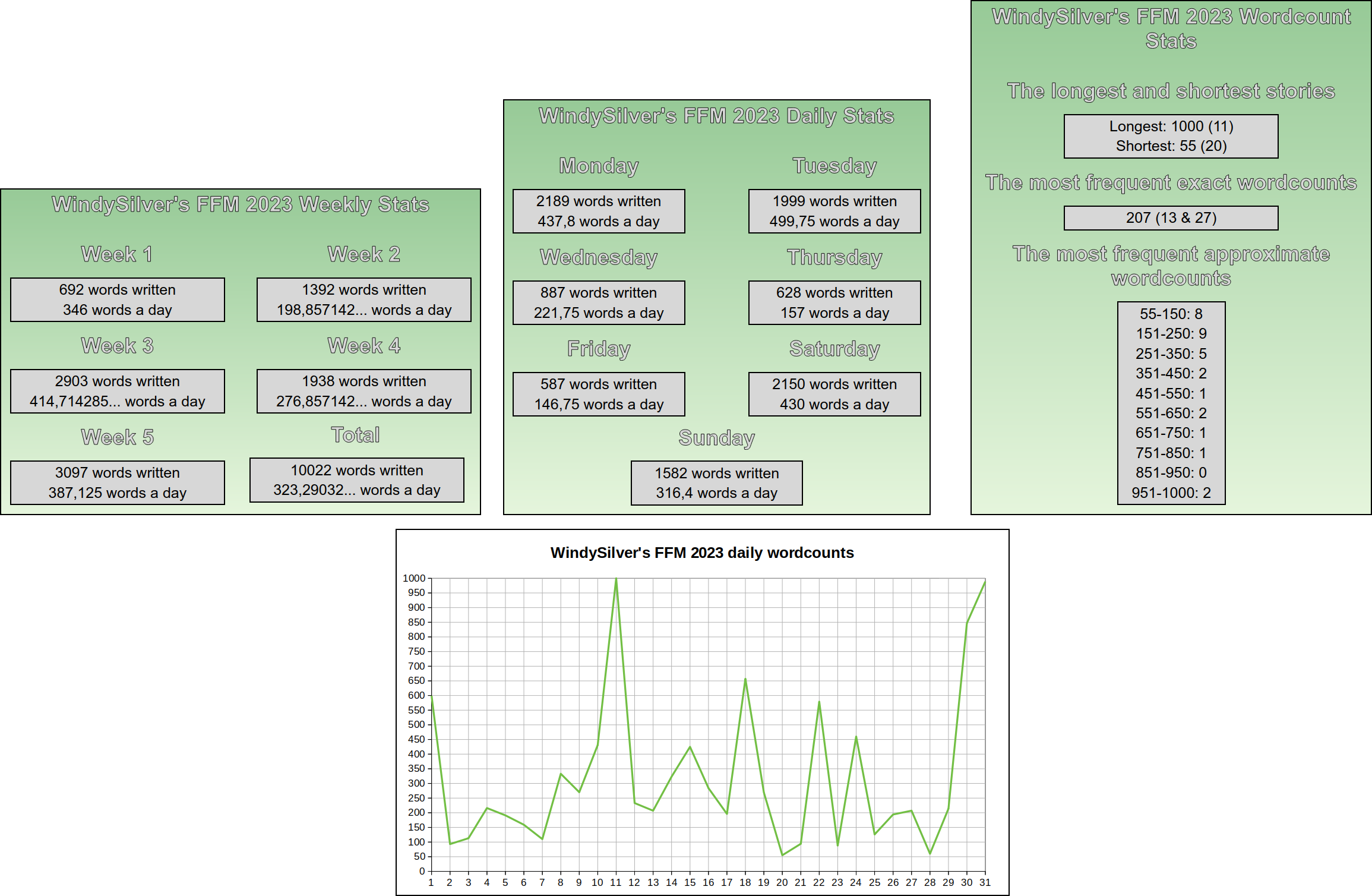 So, FFM 2023 happened despite it first looking like nothing official is going to happen. Myself and many others were discussing organizing our own FFM only for the hydra to suddenly come out of the woodwork and not only organize the FFM this year but also migrate to WordPress. I had a good time, as expected. There isn’t much to say about FFM aside from that; outside of challenges, I focused primarily on a single character from my previous flashfics, Bereth. Why? I don’t know. My post-workday brains latched onto the situation he had been left to and ran with it. Was this my worst FFM so far? It might have been; it was my first FFM with a huge workload from a summer job, so I feel that the quality of my work has been lower throughout the summer. Number-wise, though? It went surprisingly well. See for yourselves (and note that week 5 includes 8 days, as the 31st was the sole day of the 6th “week” of this July).