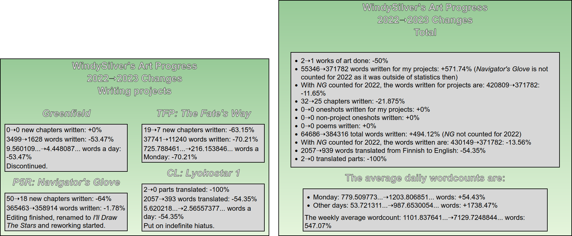 When looking at the whole picture, 2023 hasn’t been particularly good for my projects – between one discontinuation, two projects put on indefinite hiatus and TFW and NG experiencing more or less dramatic decreases in performance, it’s been a worse year than the previous one, although bringing NG into the statistics halfway through it did skew some numbers.