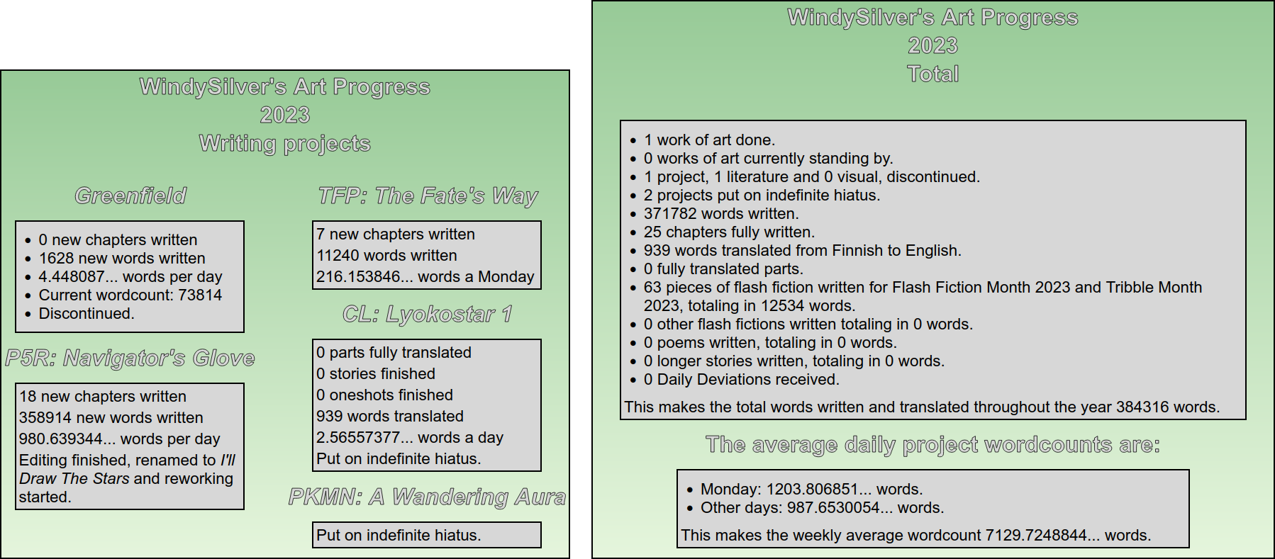 - Off-DA projects: I made and released the 2023 World Collections. My master’s thesis progresses slowly; I’m almost 50% done with gathering data.