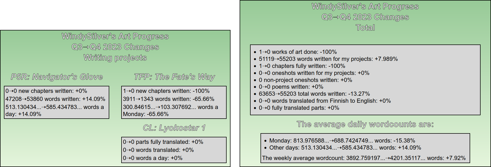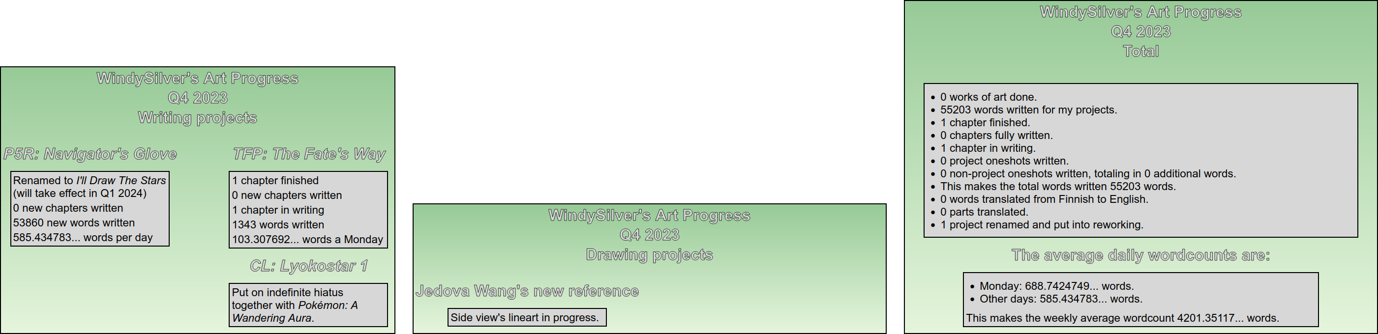 - Navigator’s Glove: The fleshing out of what was known as the epilogue has been finished and divided into 12 chapters and the story’s editing has been finished. Now I’m reworking to add a considerably big plot bunny into the fic and lots of smaller plot bunnies in the form of the background characters I’ve been researching for my master’s thesis. In addition to this, I’ve renamed the story to I’ll Draw The Stars (on your glove, on your ribbon, on my masks), IDTS (GRM) for short. The new naming will take effect in my statistics in Q1 2024. I wrote 53860 words during Q4.