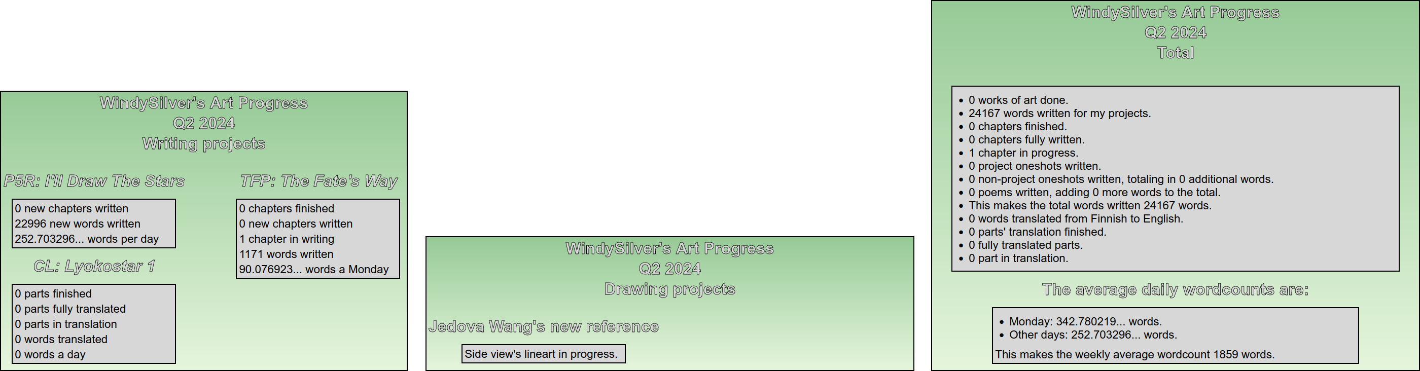 - I’ll Draw The Stars: I’m reworking to add a considerably big plot bunny into the fic and lots of smaller plot bunnies in the form of the background characters I’ve been researching for my master’s thesis. I’m currently working on chapter 18 out of 81. I wrote 22996 words in Q2.