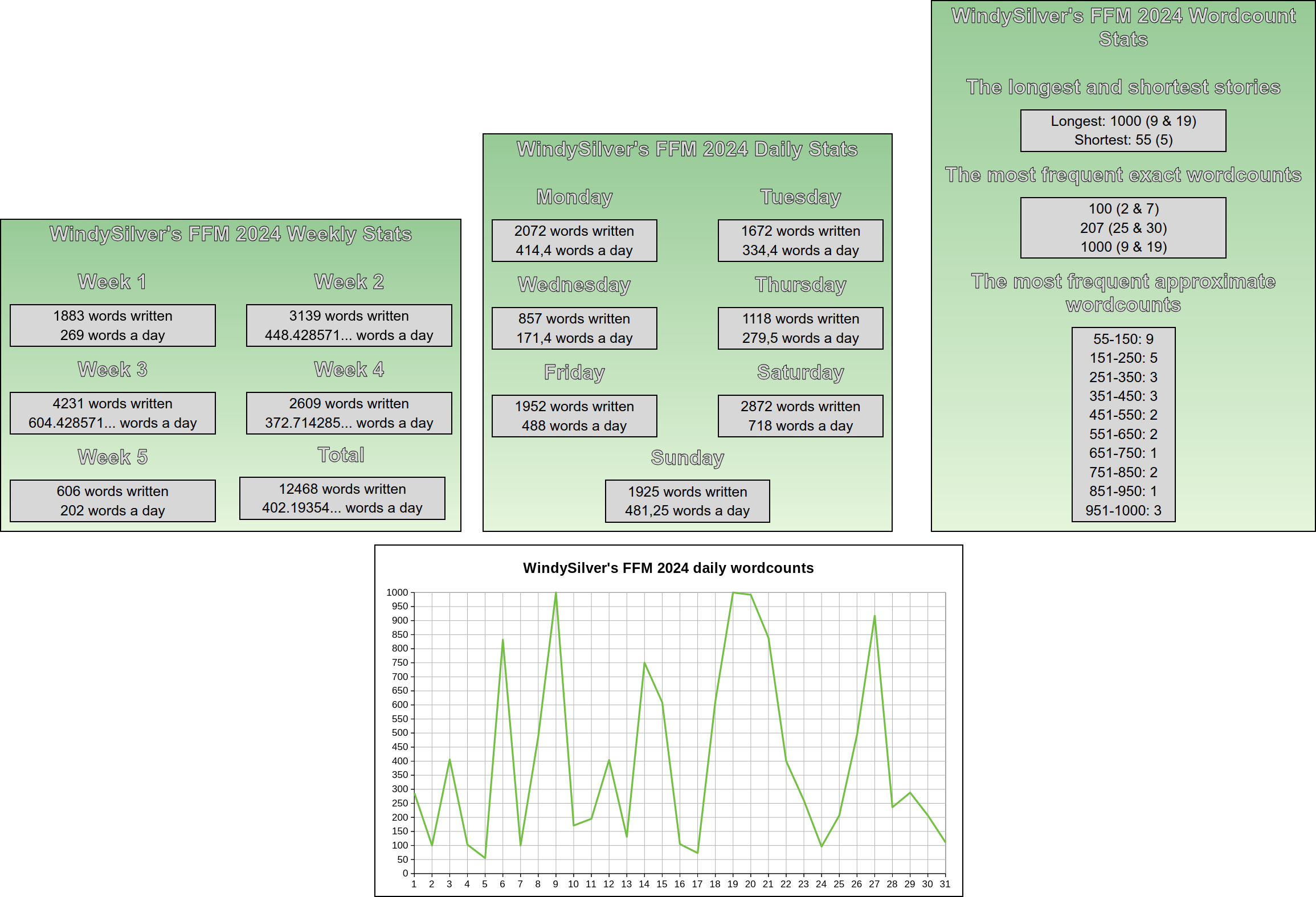 So, first things first. FFM 2024 came and went without major issues. I had a much better year headspace-wise, which I’m sure showed in my work, although I did struggle with muses quite a lot and was quite all over the place with where my stories were set. I also ended up writing three whopping pieces of Persona 5 Royal fanfiction, haha! The two longer ones of those are definitely some of my best works from this FFM. In any case, I’d say it was a success, especially considering the fact that my statistics are saying that wordcount-wise it was the best year since 2015, surpassing 2021 with a mere hundreds of words in the total wordcount. Viva!