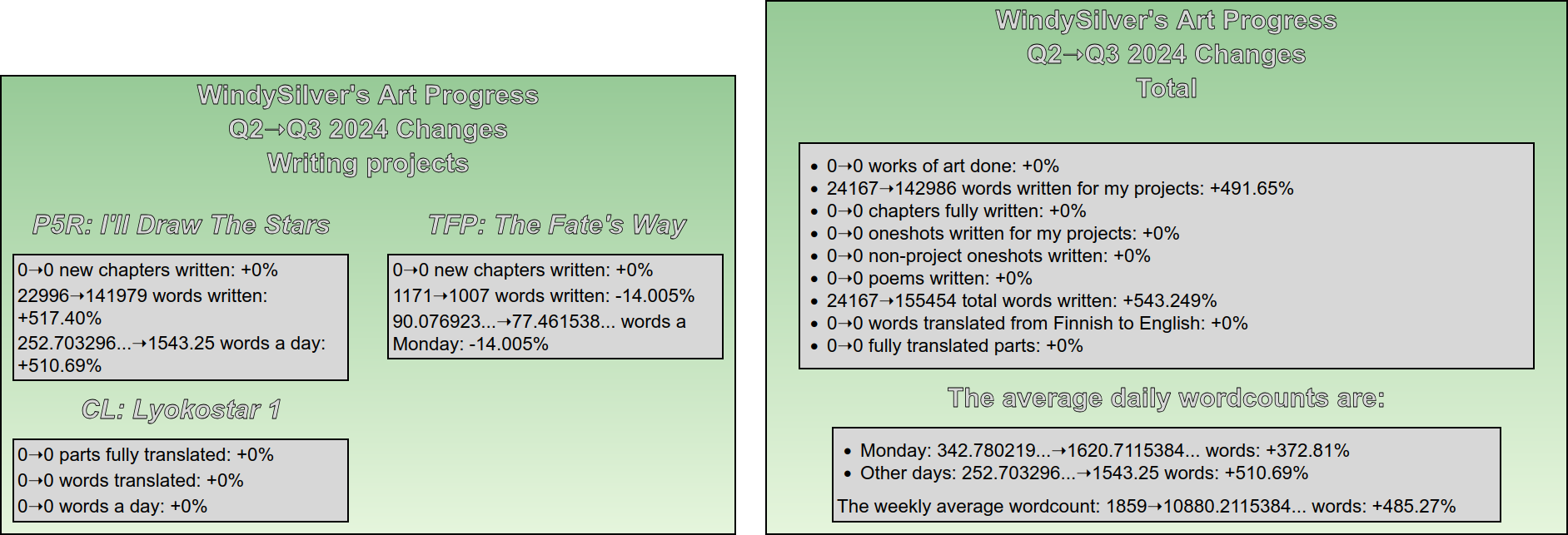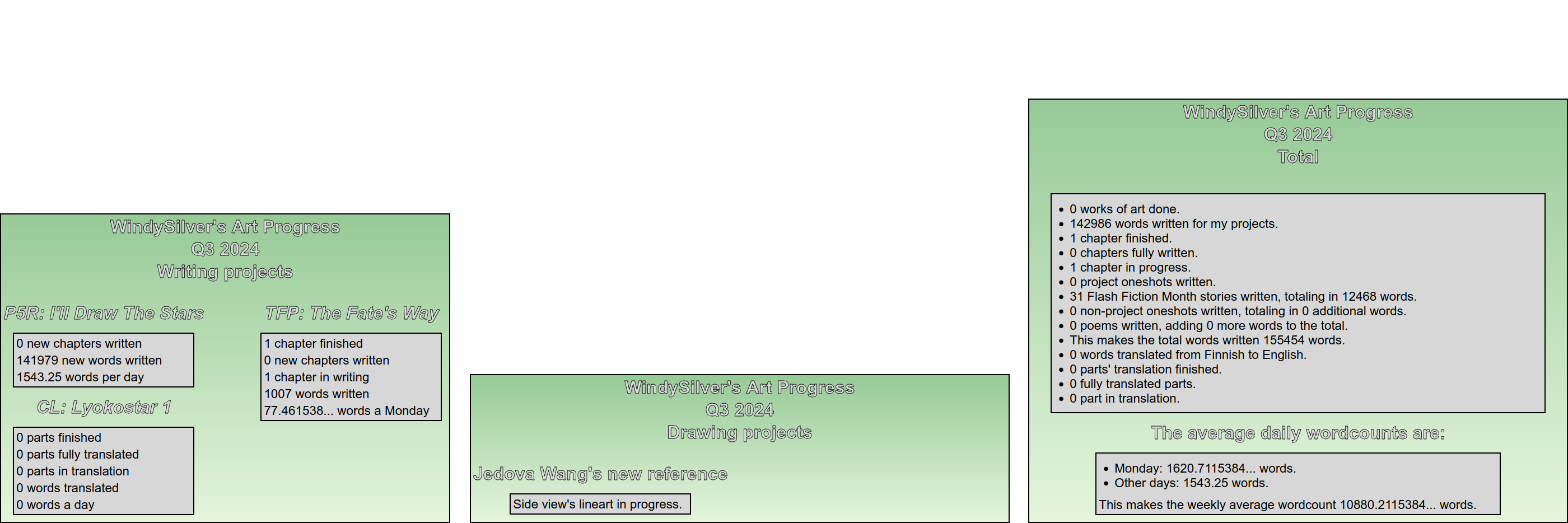 - I’ll Draw The Stars: I’m reworking to add a considerably big plot bunny into the fic and lots of smaller plot bunnies in the form of the background characters I’ve been researching for my master’s thesis. I’m currently working on chapter 42 out of (currently) 87. I somehow wrote whopping 141979 words in this quarter.