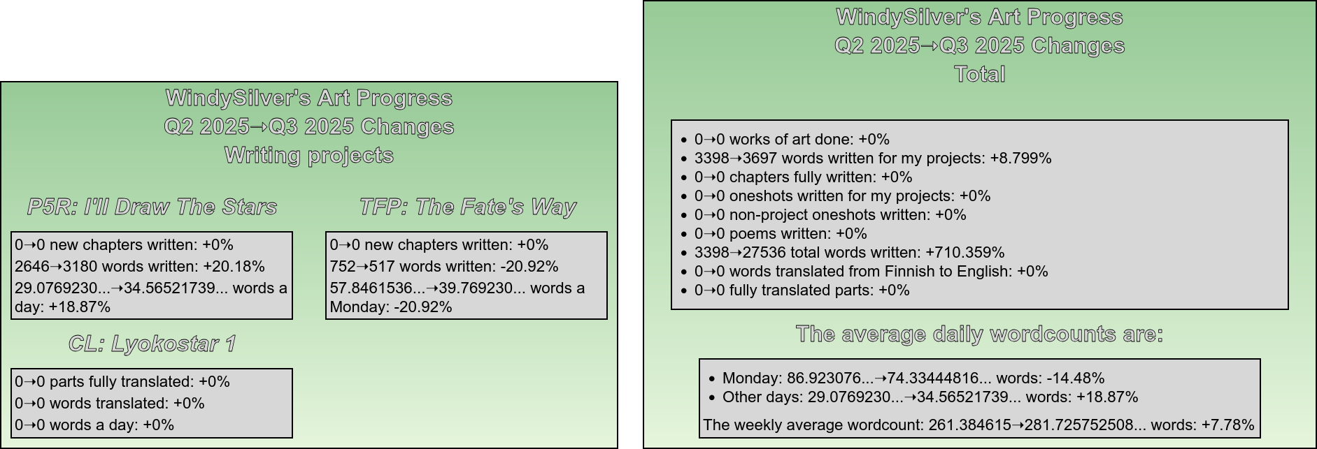 It’s kinda funny how the poorer progress with TFW and improved progress with IDTS come close to canceling each other out. Can’t say I’m surprised about these, though; a lot of my writing time and energy has gone to worldbuilding for Whoops, so not that much has happened with my older active projects.