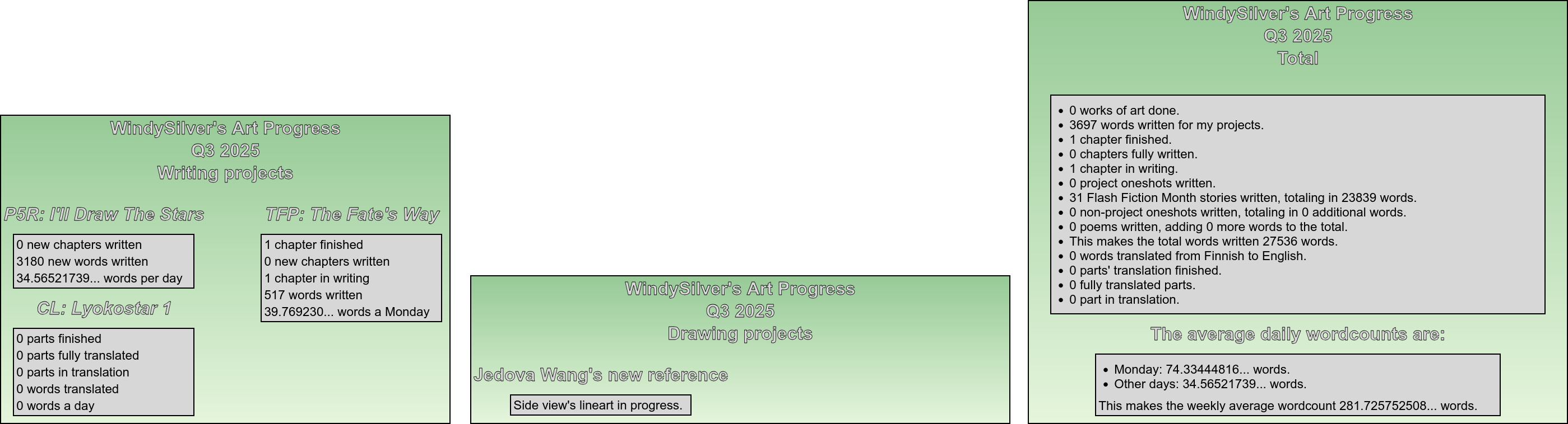 - I’ll Draw The Stars: I’m reworking to add a considerably big plot bunny into the fic and lots of smaller plot bunnies in the form of the background characters I researched for my master’s thesis. I’m currently working on chapter 84 out of (currently) 89. I wrote 3180 words in this quarter; it’s still very slow progress.